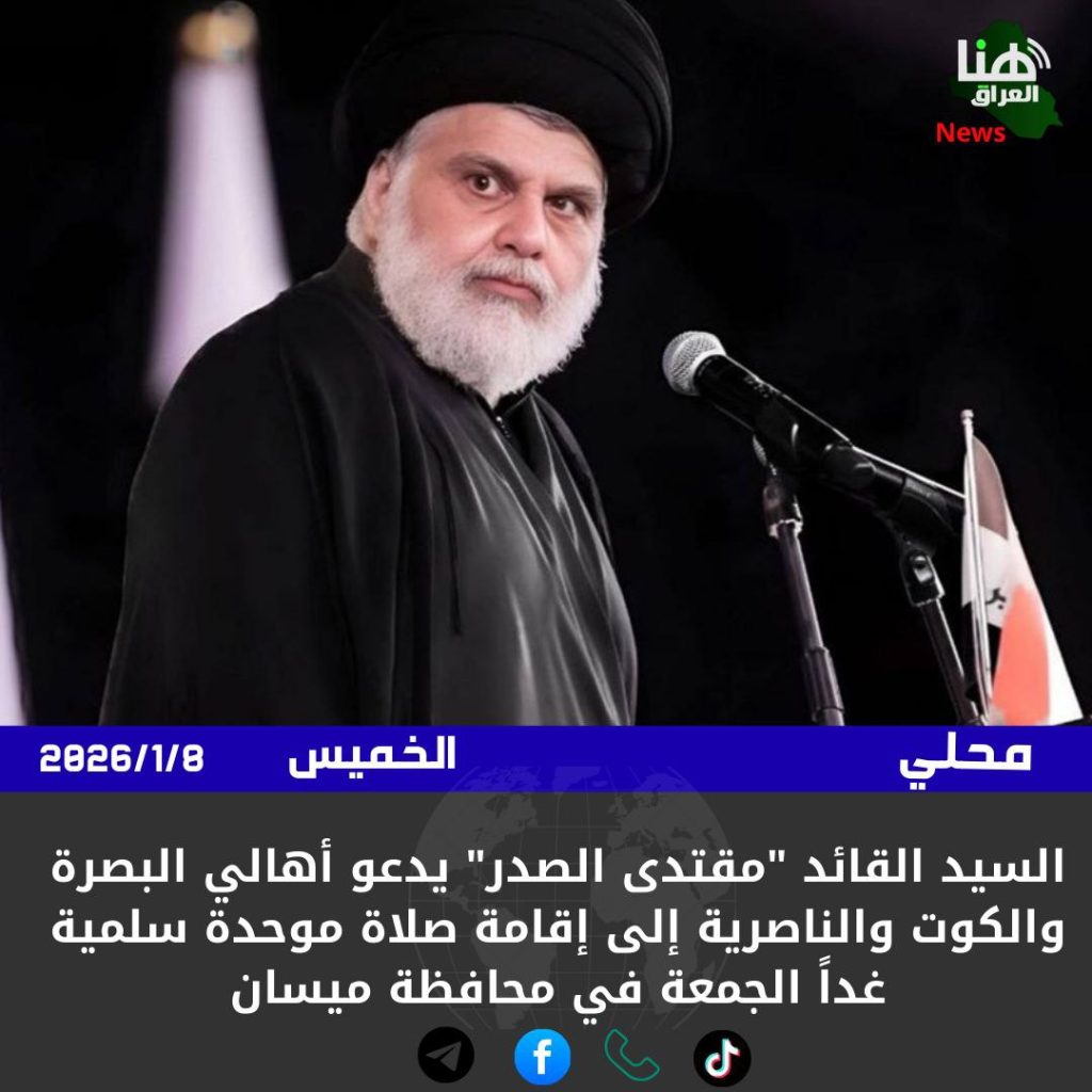 السيد القائد “مقتدى الصدر” يدعو أهالي البصرة والكوت والناصرية إلى إقامة صلاة موحدة سلمية غداً الجمعة في محافظة ميسان