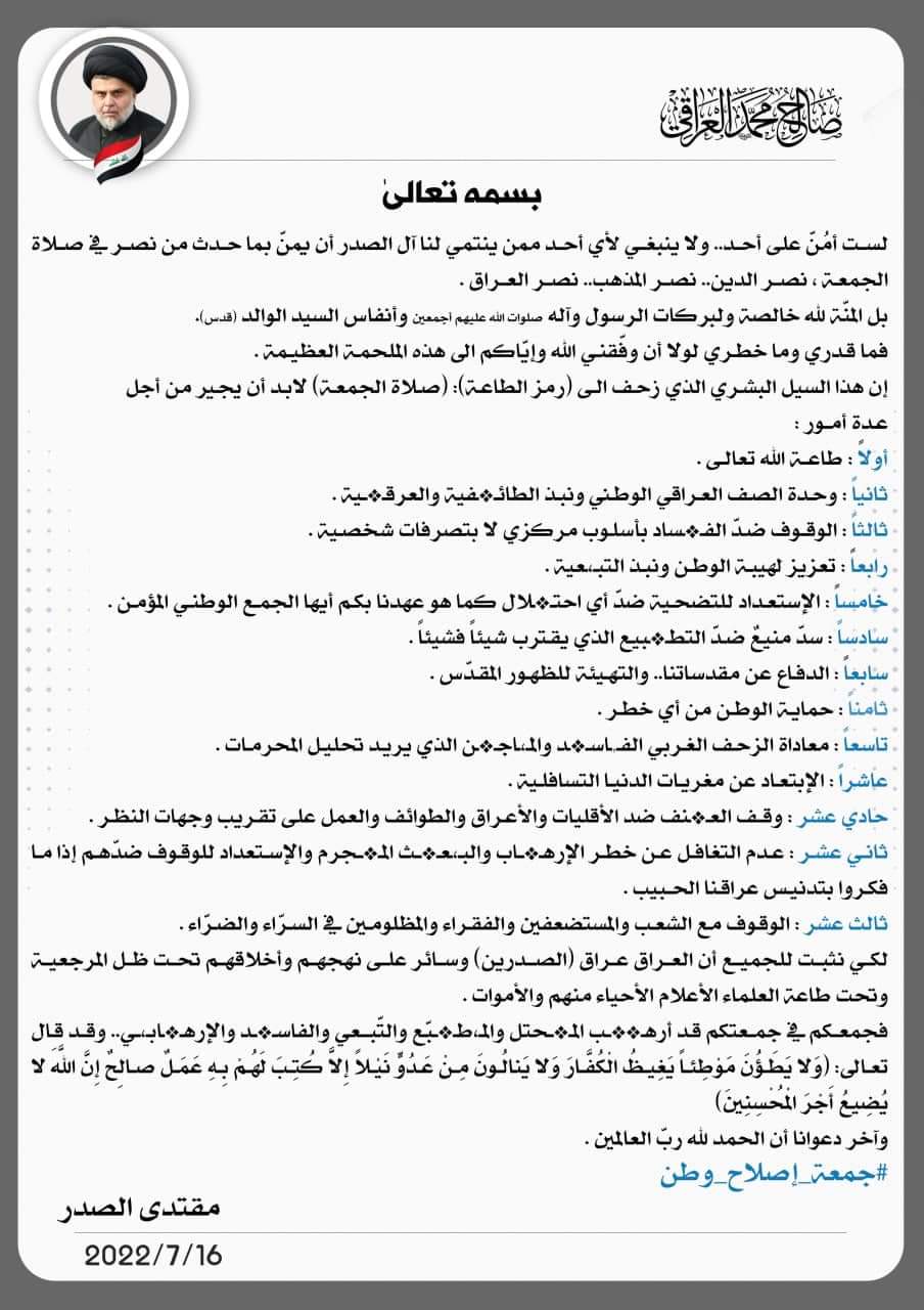 حدد زعيم التيار الصدري مقتدى الصدر، اليوم السبت، 13 أمراً تخص الصلاة التي جرت أمس الجمعة في مدينة الصدر شرقي بغداد.