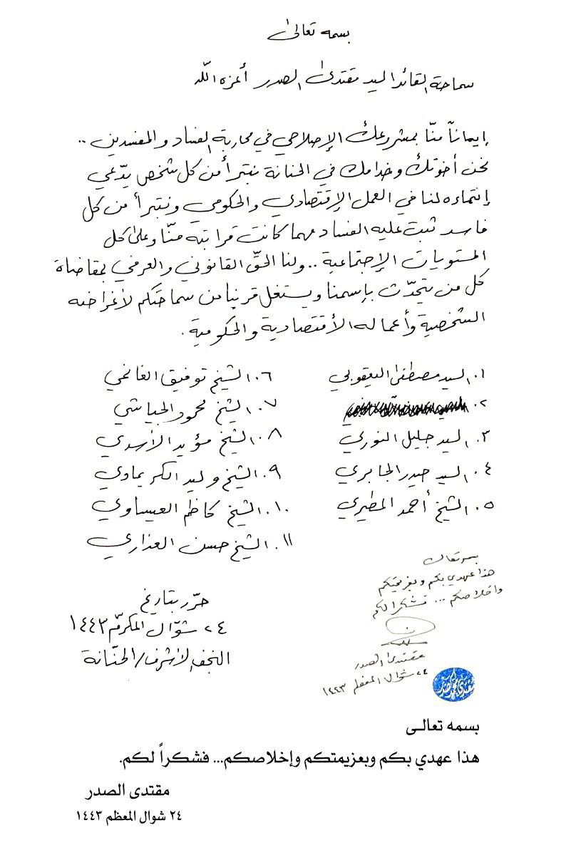 قدم زعيم التيار الصدري مقتدى الصدر، اليوم الأحد، شكره للعاملين في الحنانة لتبرؤهم من كل شخص يدّعي انتماءه لهم في العمل الاقتصادي والحكومي ومن كل شخص فاسد ثبت عليه الفساد مهما كانت قرابته.