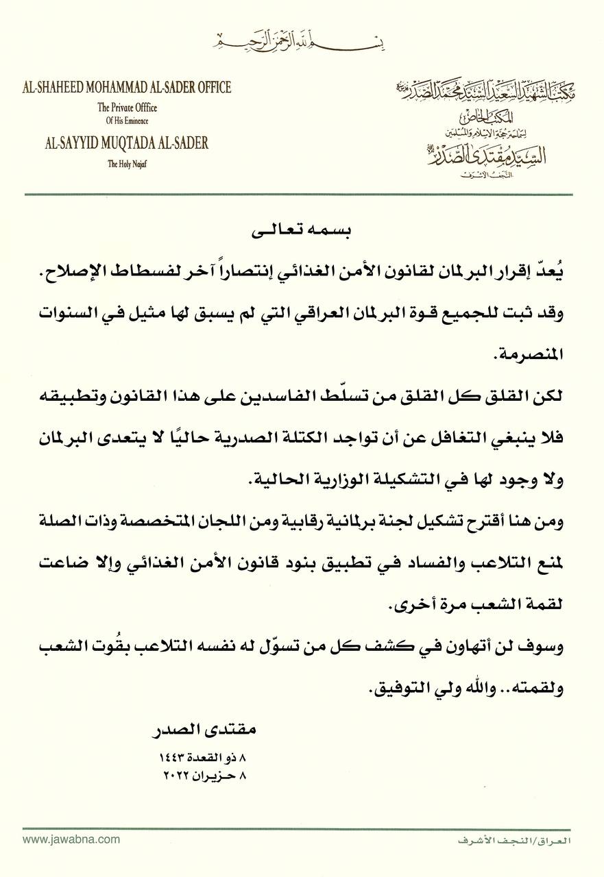 وقال الصدر في تغريدة عبر تويتر، إنه “يعد إقرار البرلمان لقانون الأمن الغذائي والتنمية انتصارا آخرا لفسطاط الاصلاح. وقد ثبت للجميع قوة البرلمان العراقي التي لم يسبق لها مثيل في السنوات السابقة”.