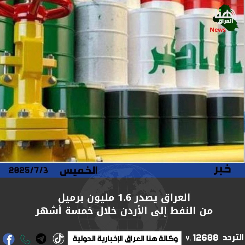 أعلنت شركة تسويق النفط العراقية (سومو) أن العراق صدّر أكثر من 1.6 مليون برميل من النفط الخام إلى الأردن خلال الأشهر الخمسة الأولى من العام الحالي، بانخفاض نسبته 10.39% مقارنة بالفترة ذاتها من العام الماضي.