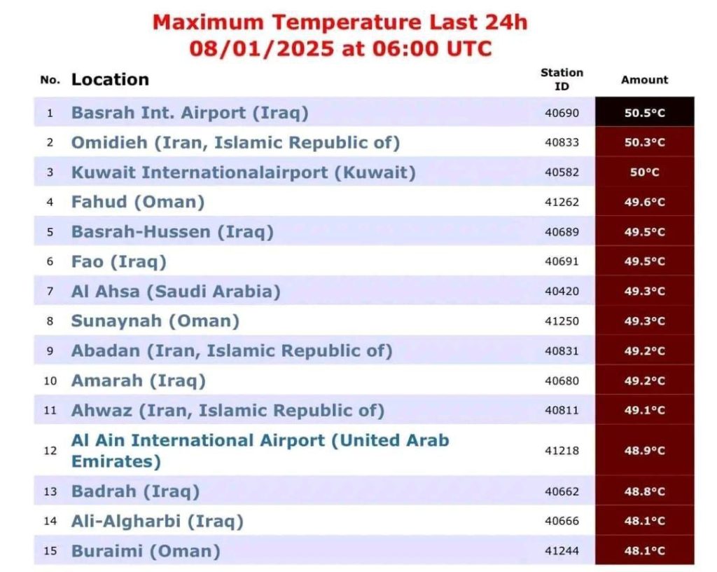 الرئيسية/الطقس/العراق يعود الاول عالميا بارتفاع درجات الحرارة … فيما سجلت 6 مدن عراقية الأعلى حرارة من بين 15 مدينة عالمية الطقسدوليمحلي العراق يعود الاول عالميا بارتفاع درجات الحرارة … فيما سجلت 6 مدن عراقية الأعلى حرارة من بين 15 مدينة عالمية شاركها فيسبوك X لينكدإن Tumblr بينتيريست Reddit VKontakte Odnoklassniki Pocket مشاركة عبر البريد طباعة