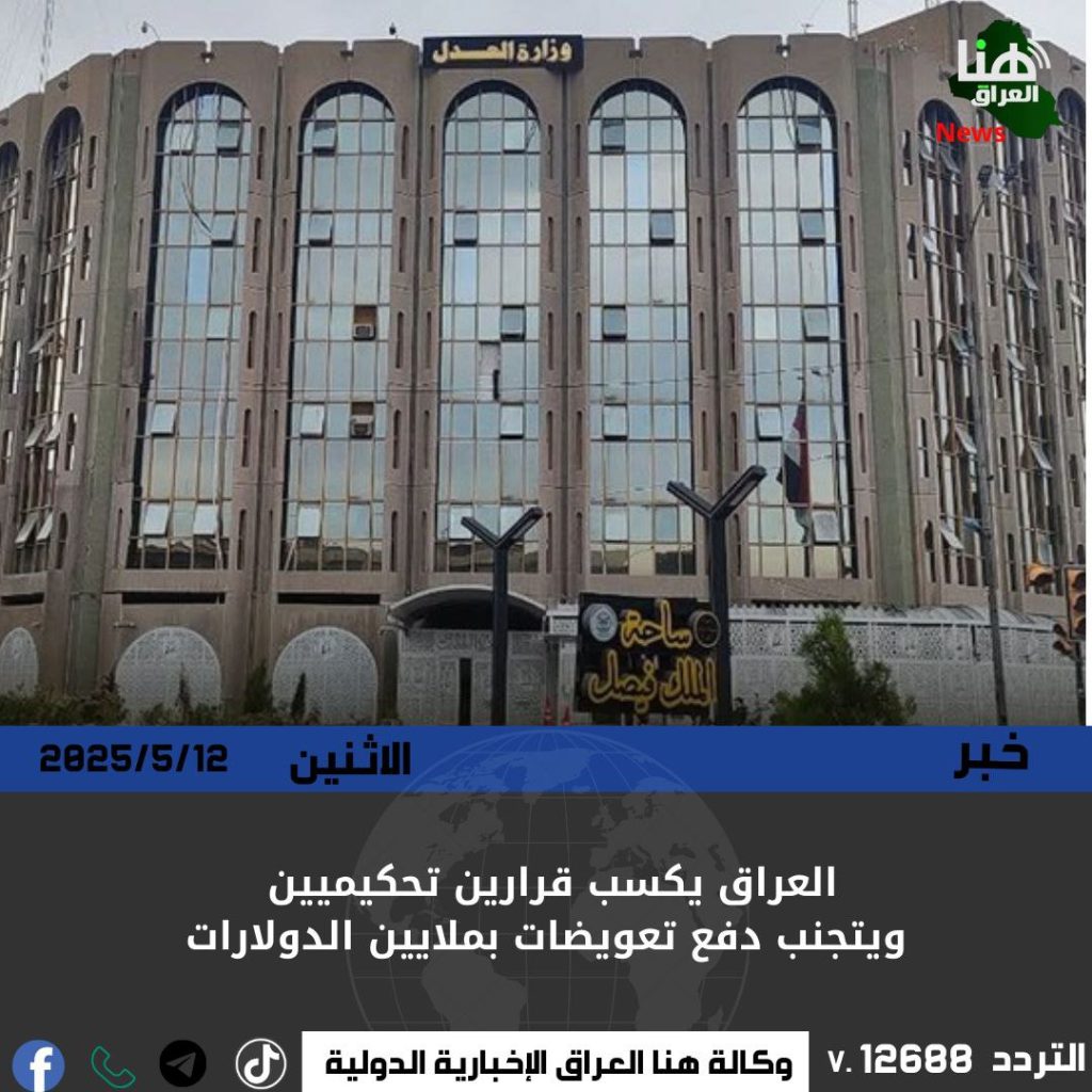 أعلنت وزارة العدل، اليوم الاثنين، أن العراق كسب دعويين قضائيتين رفعتا ضده من قبل شركتين أجنبيتين، إحداهما في مركز التحكيم الدولي بدبي، والأخرى أمام المحكمة التجارية في الإسكندرونة.