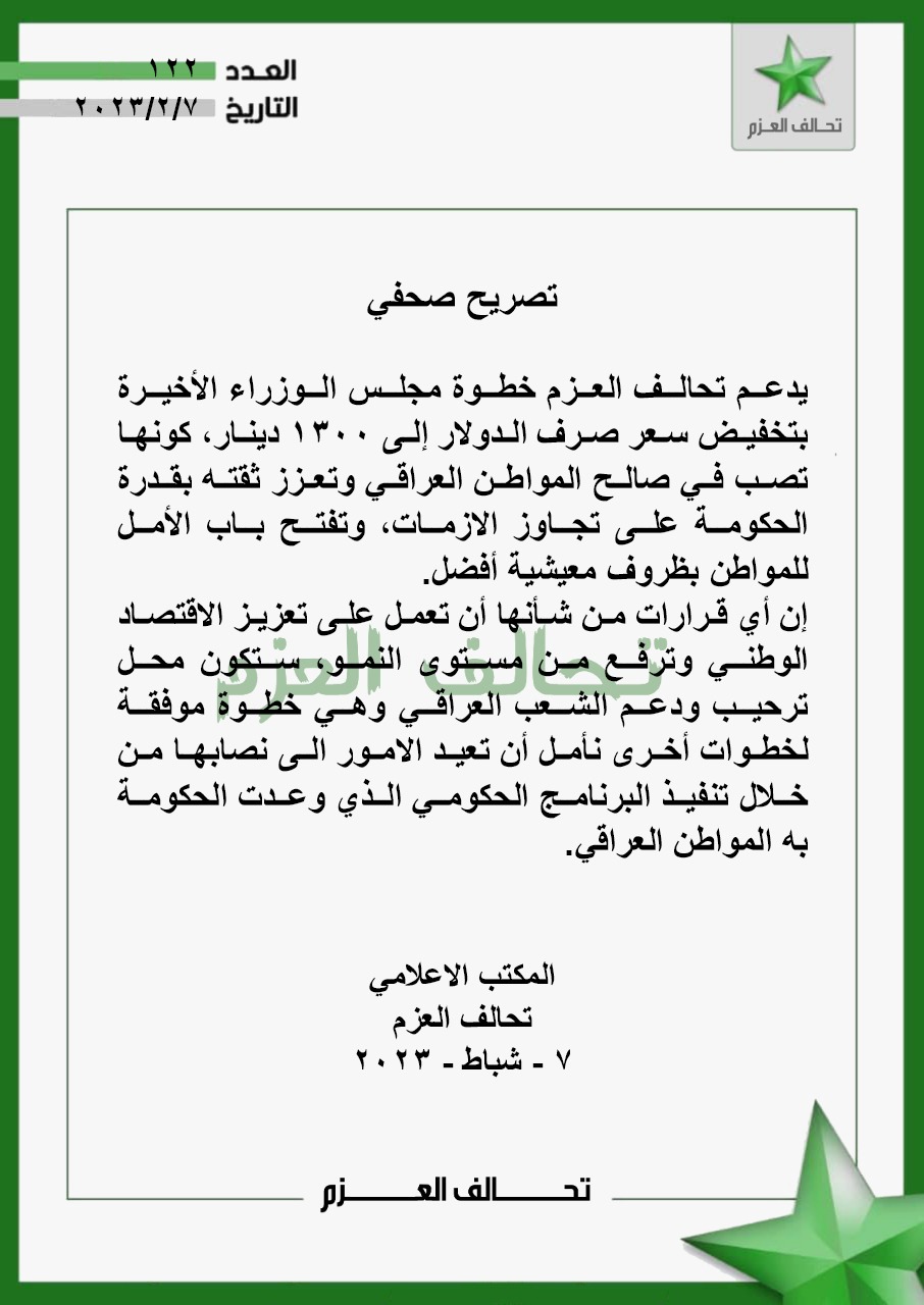أكد تحالف العزم، اليوم الثلاثاء، دعمه لخطوة مجلس الوزراء بخفض سرعر صرف الدولار مقابل الدينار العراقي.