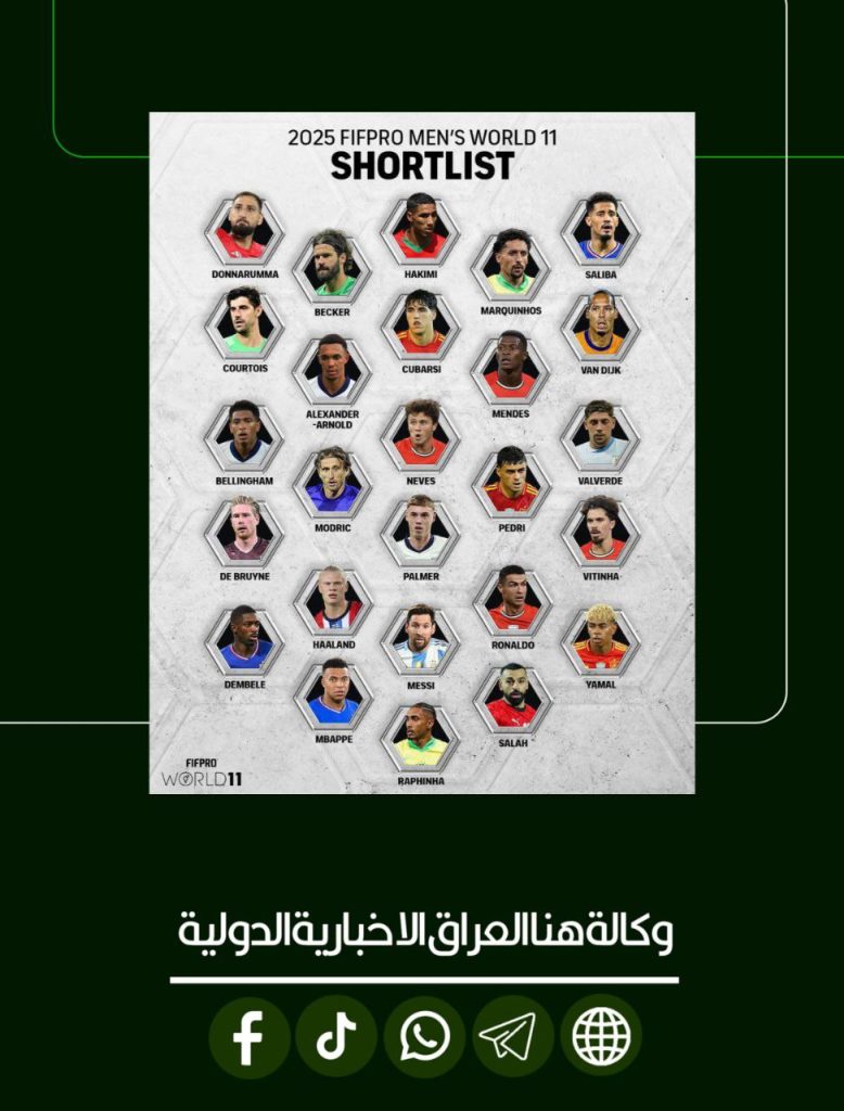 القائمة المختصرة المكونة من 26 لاعبًا لجائزة التشكيلة المثالية للرجال لعام 2025، كما صوّت لها اللاعبون حول العالم.