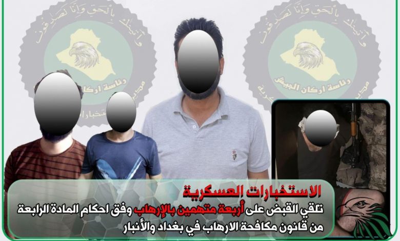 أعلنت مديرية الاستخبارات العسكرية، اليوم الأربعاء، القبض على أربعة متهمين بالإرهاب وفق احكام المادة الرابعة من قانون مكافحة الارهاب في بغداد والأنبار.