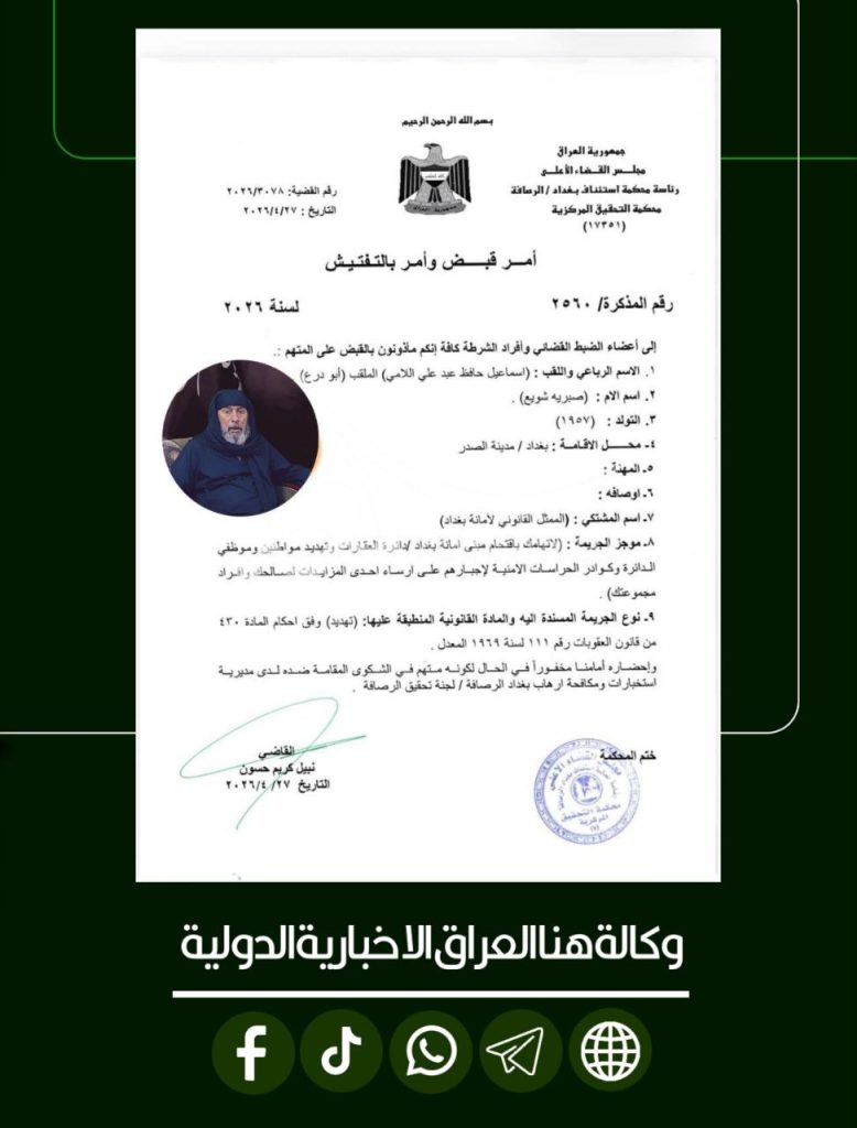 الرئيسية/امن/القضاء يصدر مذكرة إلقاء القبض بحق (أبو درع) بتهمة اقتحام دائرة حكومية تابعة لأمانة بغداد امنمحلي القضاء يصدر مذكرة إلقاء القبض بحق (أبو درع) بتهمة اقتحام دائرة حكومية تابعة لأمانة بغداد