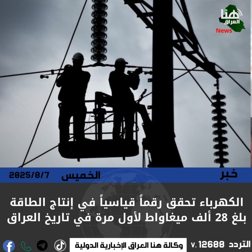 الكهرباء تحقق رقماً قياسياً في إنتاج الطاقة بلغ 28 ألف ميغاواط لأول مرة في تاريخ العراق
