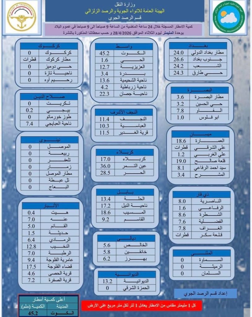 الرئيسية/الطقس/الكوت تسجل أعلى معدل لهطول الأمطار في العراق بواقع 45.2 ملم خلال الـ24 ساعة الماضية الطقسمحلي الكوت تسجل أعلى معدل لهطول الأمطار في العراق بواقع 45.2 ملم خلال الـ24 ساعة الماضية شاركها فيسبوك X لينكدإن Tumblr بينتيريست Reddit VKontakte Odnoklassniki Pocket مشاركة عبر البريد طباعة