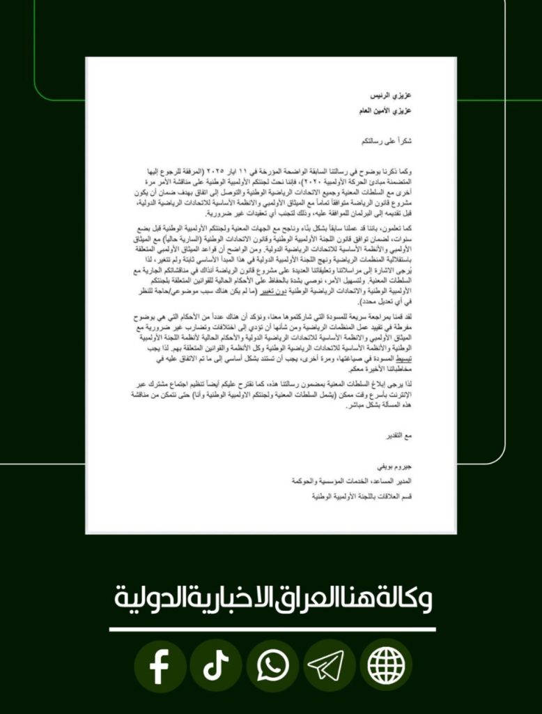 الرئيسية/رياضة/اللجنة الاولمبية الدولية تطالب العراق بتعديل مشروع قانون الرياضة الموحد لضمان توافقه مع الميثاق الأولمبي رياضة اللجنة الاولمبية الدولية تطالب العراق بتعديل مشروع قانون الرياضة الموحد لضمان توافقه مع الميثاق الأولمبي شاركها فيسبوك X لينكدإن Tumblr بينتيريست Reddit VKontakte Odnoklassniki Pocket مشاركة عبر البريد طباعة