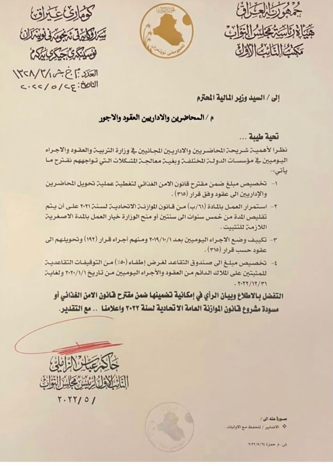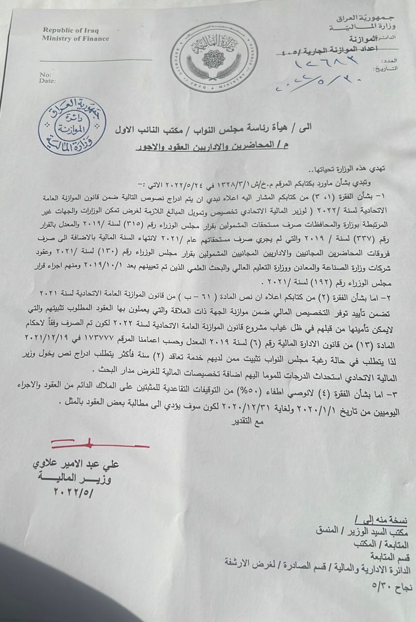 زير المالية استجابة لمخاطبة ومطالبة النائب الاول لرئيس مجلس النواب حاكم الزاملي بشأن تضمين التخصيصات اللازمة لتحويل المحاضرين والاداريين المجانيين في وزارة التربية الى عقود وفق قرار ٣١٥ وصرف الفروقات الكاملة لهم ، وتكييف وضع الاجراء اليوميين وتحويلهم الى عقود”.