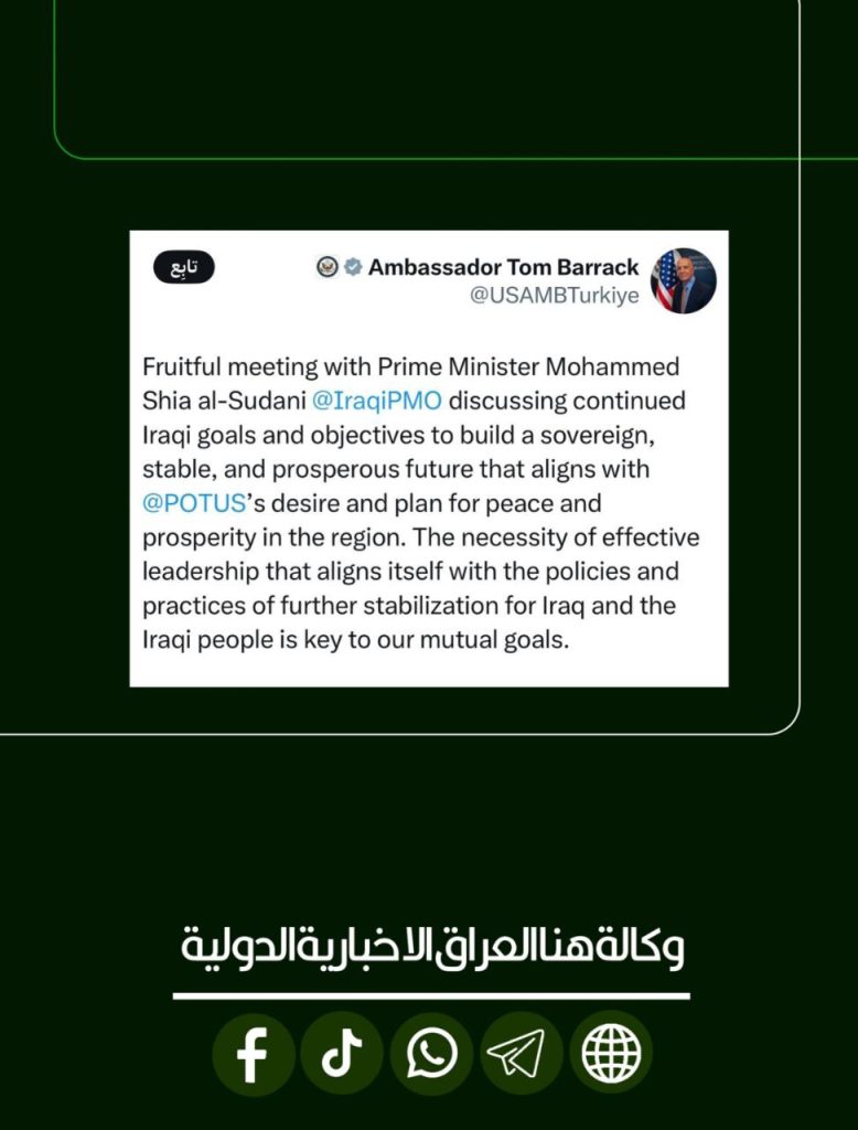 براك: وجود قيادة فعالة تتبنى سياسات تعزيز الاستقرار في العراق وشعبه أمر أساسي لتحقيق أهدافنا المشتركة