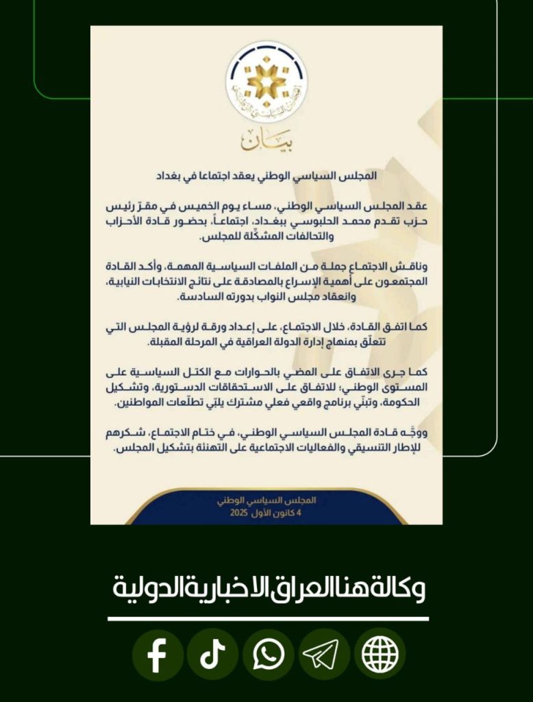 المجلس السياسي الوطني: أهمية الإسراع بالمصادقة على نتائج الانتخابات وانعقاد البرلمان بدورته السادسة