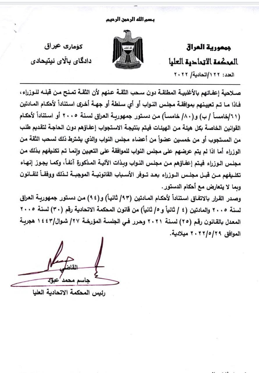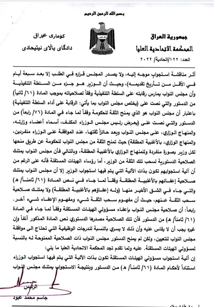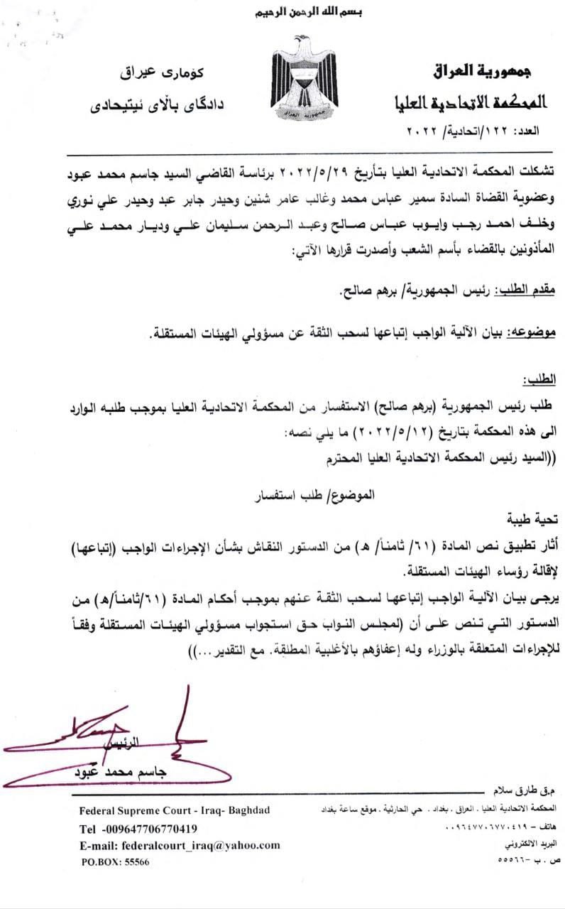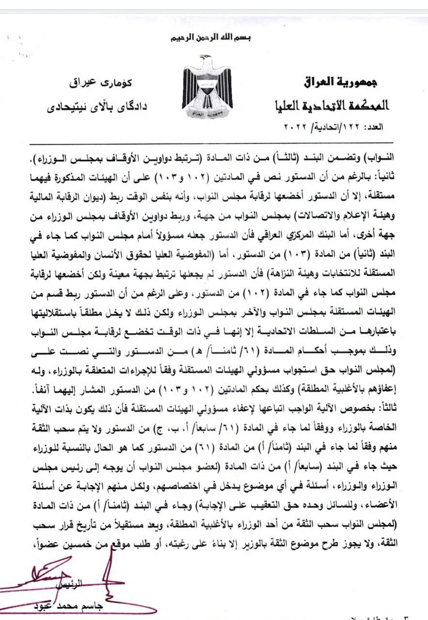 أصدرت المحكمة الاتحادية العليا، اليوم الخميس، قرارها التفسيري بالعدد (122/ اتحادية / 2022) المتضمن تحديد آلية استجواب مسؤولي الهيئات المستقلة وفقاً لأحكام الدستور.