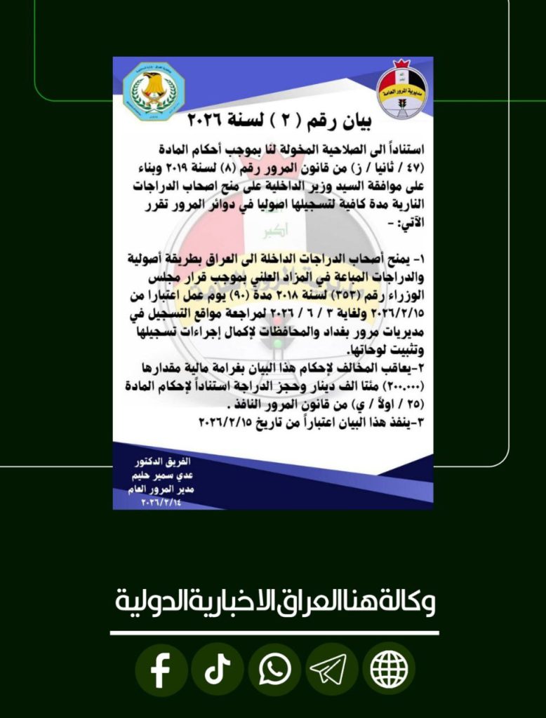 الرئيسية/امن/المرور تمنح الدراجات النارية الأصولية والمباعة في المزاد العلني 90 يوماً لتسجيلها امنمحلي المرور تمنح الدراجات النارية الأصولية والمباعة في المزاد العلني 90 يوماً لتسجيلها شاركها فيسبوك X لينكدإن Tumblr بينتيريست Reddit VKontakte Odnoklassniki Pocket مشاركة عبر البريد طباعة