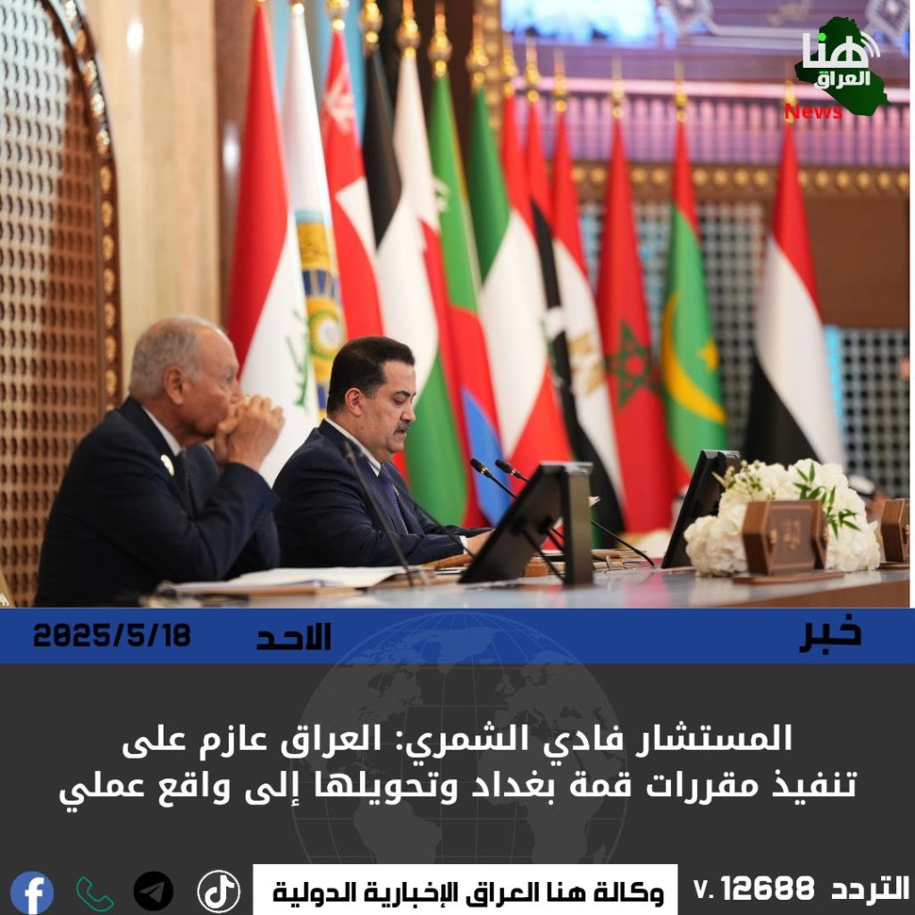 أكد المستشار السياسي لرئيس الوزراء، فادي الشمّري، أن العراق ماضٍ في تنفيذ مقررات القمة العربية التي اختتمت في بغداد، مشيراً إلى أن ما يميز هذه القمة هو عدد المبادرات التي طرحت، والتي بلغ عددها أكثر من 18 مبادرة، شملت قضايا سياسية وأمنية واقتصادية، فضلاً عن ملفات التحول الرقمي والذكاء الاصطناعي.