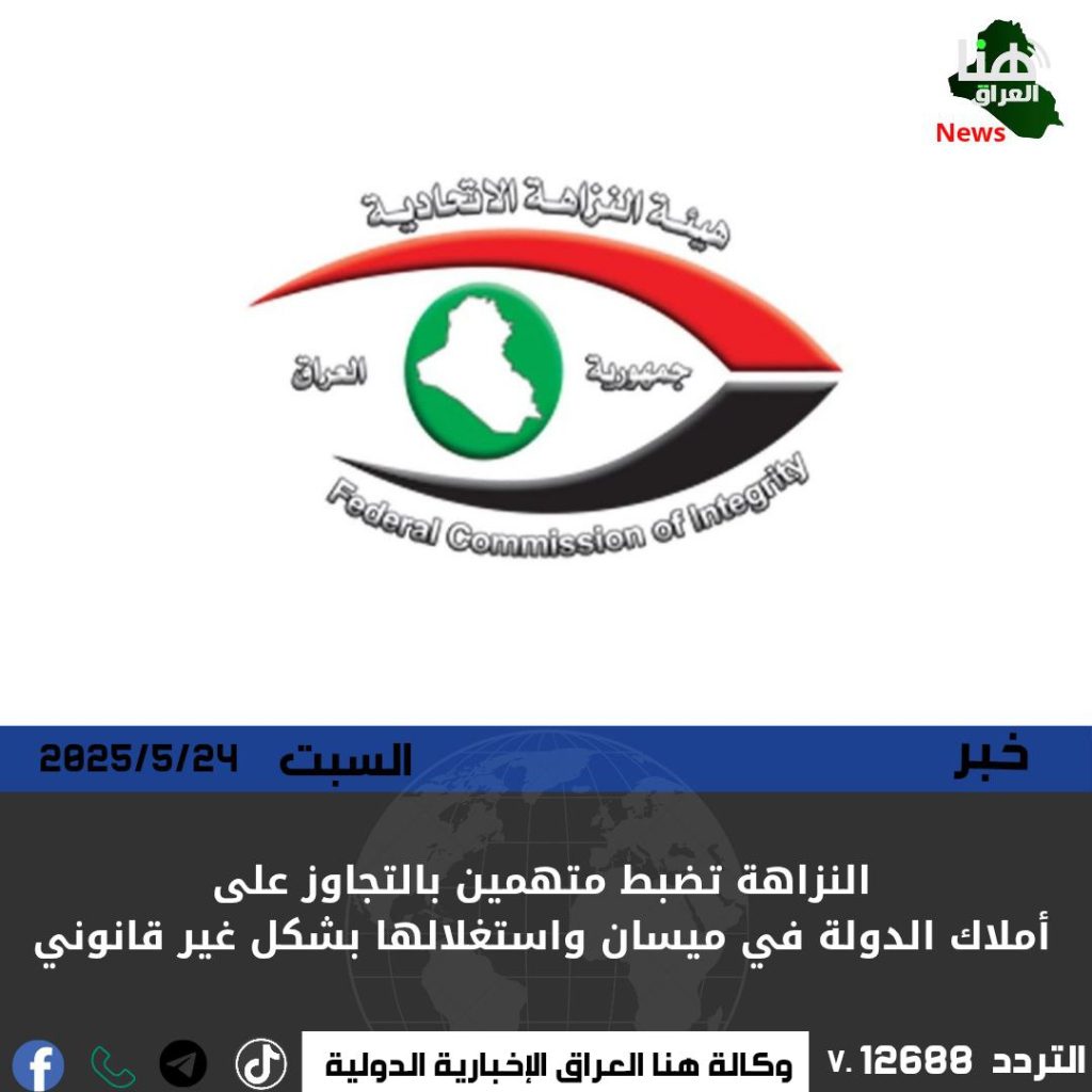 أعلنت هيئة النزاهة الاتحادية، اليوم السبت، تنفيذ عمليات ضبط بحق عدد من المتهمين بتجاوزات على عقارات وأراضٍ تعود للدولة في محافظة ميسان، مشيرة إلى أنهم قاموا بتقسيم أراضٍ زراعية وجباية أموال من المواطنين خلافاً للقانون.