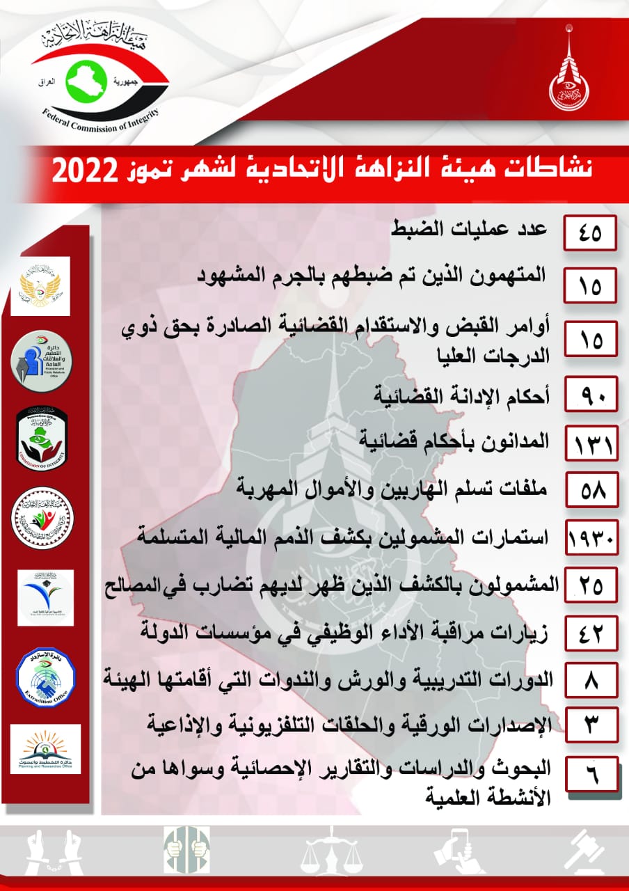 أعلنت هيئة النزاهة، اليوم الخميس، تنفيذ 45 عملية ضبط خلال تموز.