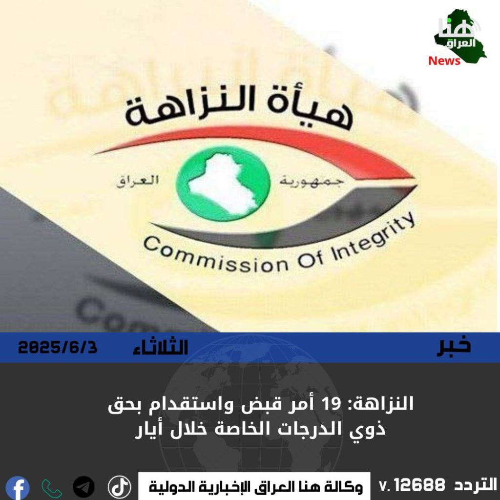 كشفت هيئة النزاهة الاتحادية، عن إصدار 19 أمر قبض واستقدام خلال شهر أيار الماضي بحق مسؤولين من ذوي الدرجات الخاصة، ضمن ملفات تتعلق بهدر المال العام وفساد إداري ومالي في مؤسسات الدولة.