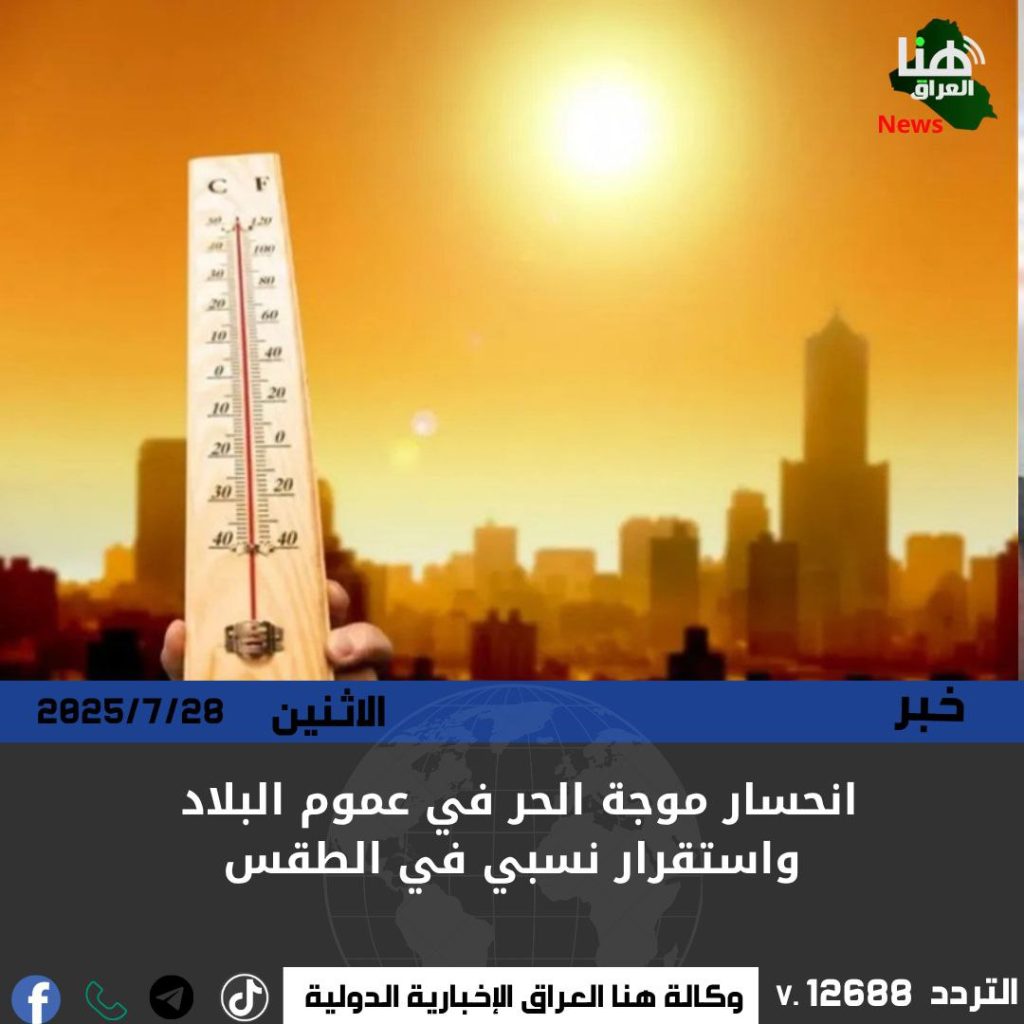تراجعت حدة الكتلة الهوائية الحارة التي أثرت على أجواء البلاد خلال الأيام الماضية، وسط استمرار الطقس الصيفي شديد الحرارة بشكل عام.