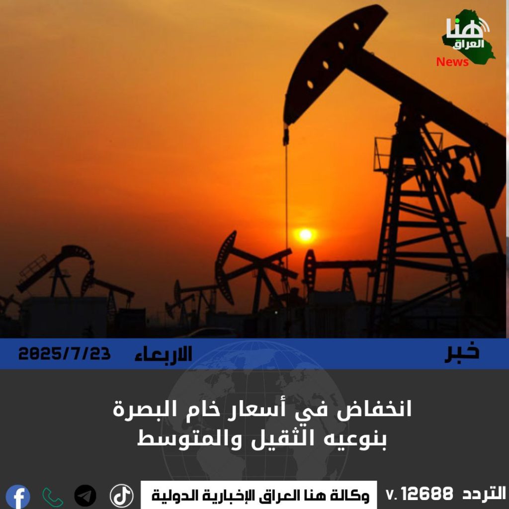 سجّلت أسعار خام البصرة انخفاضاً ملحوظاً، حيث تراجع سعر الخام الثقيل بمقدار 58 سنتًا ليبلغ 66.89 دولارًا، فيما انخفض الخام المتوسط بنفس القيمة ليصل إلى 69.94 دولارًا للبرميل.