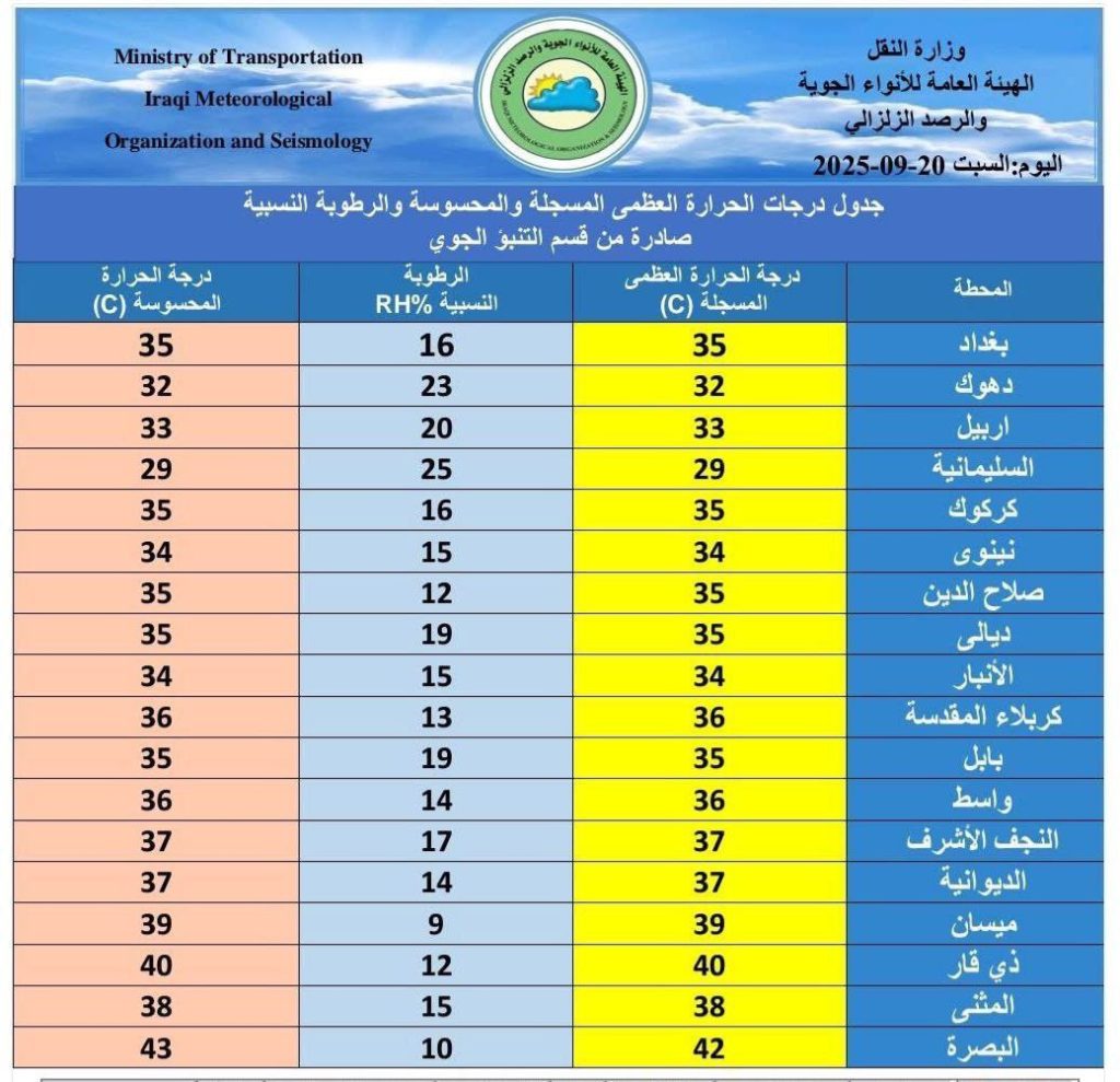 انخفاض ملحوظ بدرجات الحرارة في 15 محافظة عراقية.
