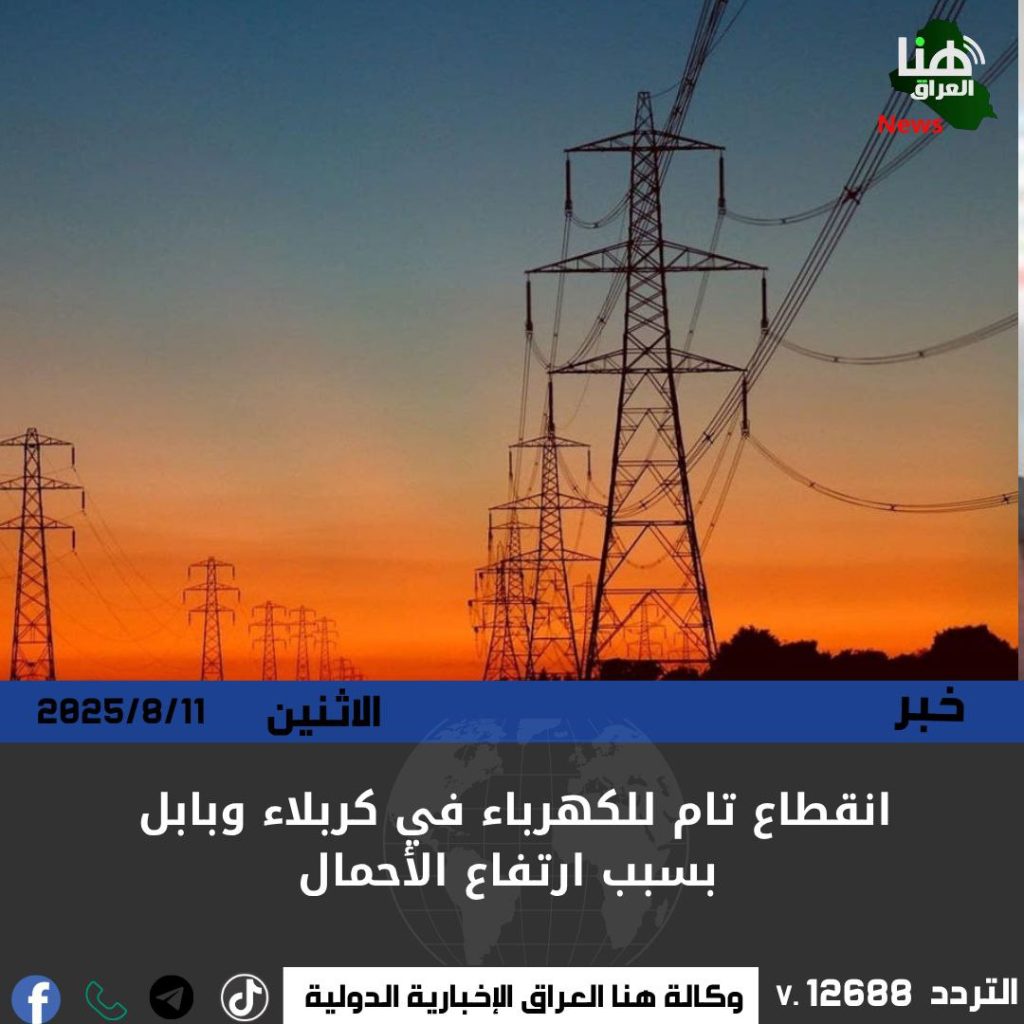 أعلنت وزارة الكهرباء عن تعرض منظومة الطاقة في كربلاء المقدسة وبابل لانقطاع تام، نتيجة ارتفاع الأحمال وانفصال خطي نقل الطاقة (مسيب – بابل 400 ك.ف)، ما تسبب بخسارة أكثر من 6000 ميغاواط من الإنتاج.