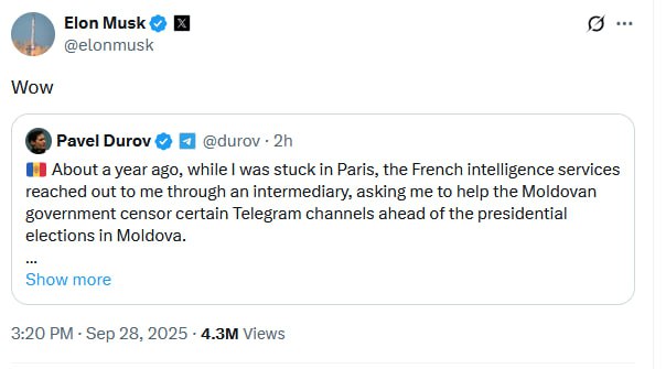 ايلون ماسك يرد على تصريحات بافيل دوروف حول توجه باريس إليه بطلب مساعدة في فرض رقابة على قنوات مولدوفية على “تلغرام” قبل الانتخابات الرئاسية