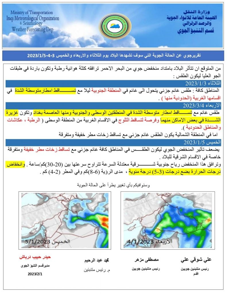 وتابع أن “طقس يوم الاربعاء سيكون غائما مع تساقط امطار متوسطة الشدة في المنطقة الوسطى والجنوبية ومنها العاصمة بغداد، وتكون غزيرة الشدة في بعض الاماكن منها، وفرصة لتساقط الثلوج في الاقسام الغربية من المنطقة الوسطى (الرطبة، عكاشات، المناطق الحدودية)، أما في المنطقة الشمالية يكون الطقس غائم جزئياً مع تساقط زخات مطر خفيفة ومتفرقة”.