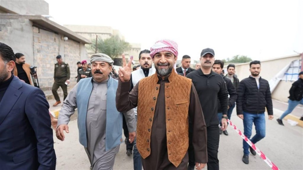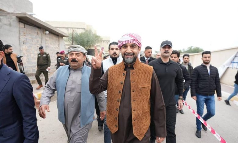 وظهر الحلبوسي على غير العادة، وهو يرتدي الزي العربي ويلف رأسه بما تعرف شعبيًا بـ”الجراوية”، من داخل مركز اقتراع في منطقة الكرمة.