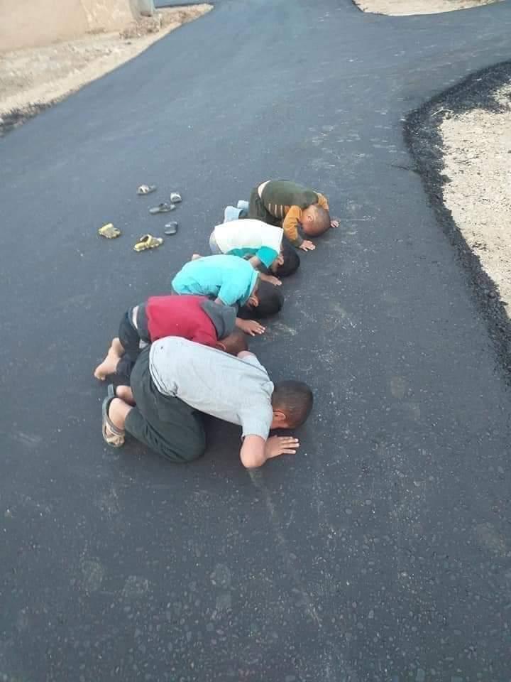وتظهر الصورة سجود أطفال فرحاً بعد تعبيد شوارع منطقتهم.