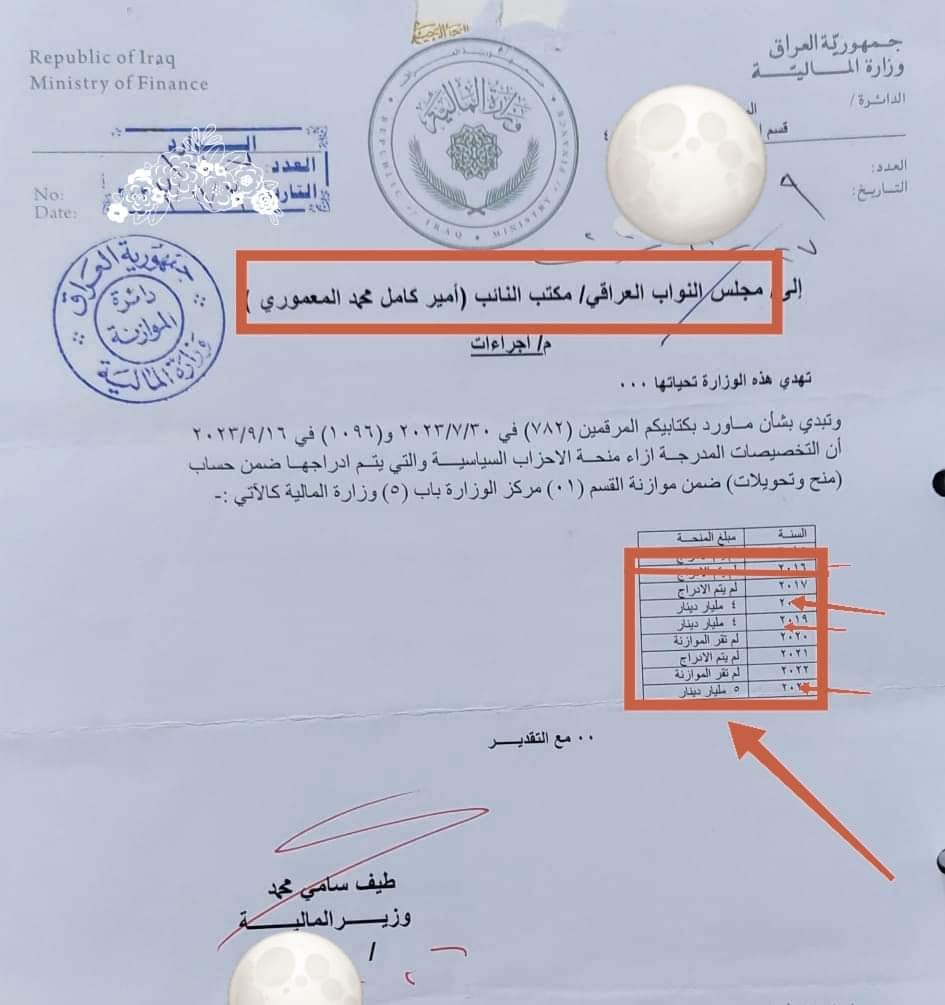 وقال المعموري في بيان، إنه”يتم صرف للأحزاب السياسية منح مالية من الموازنة، حيث تم صرف (١٨ مليار دينار) والصرف مستمر موازنة ٢٠٢٤ بخمسة مليارات”.