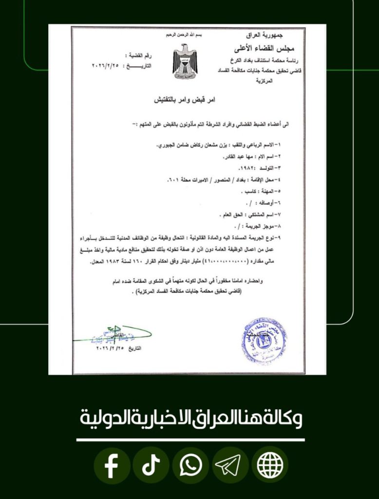 الرئيسية/امن/بالوثيقة.. أمر القبض الصادر بحق يزن مشعان الجبوري بتهمة انتحال صفة وظيفية امنمحلي بالوثيقة.. أمر القبض الصادر بحق يزن مشعان الجبوري بتهمة انتحال صفة وظيفية شاركها فيسبوك X لينكدإن Tumblr بينتيريست Reddit VKontakte Odnoklassniki Pocket مشاركة عبر البريد طباعة