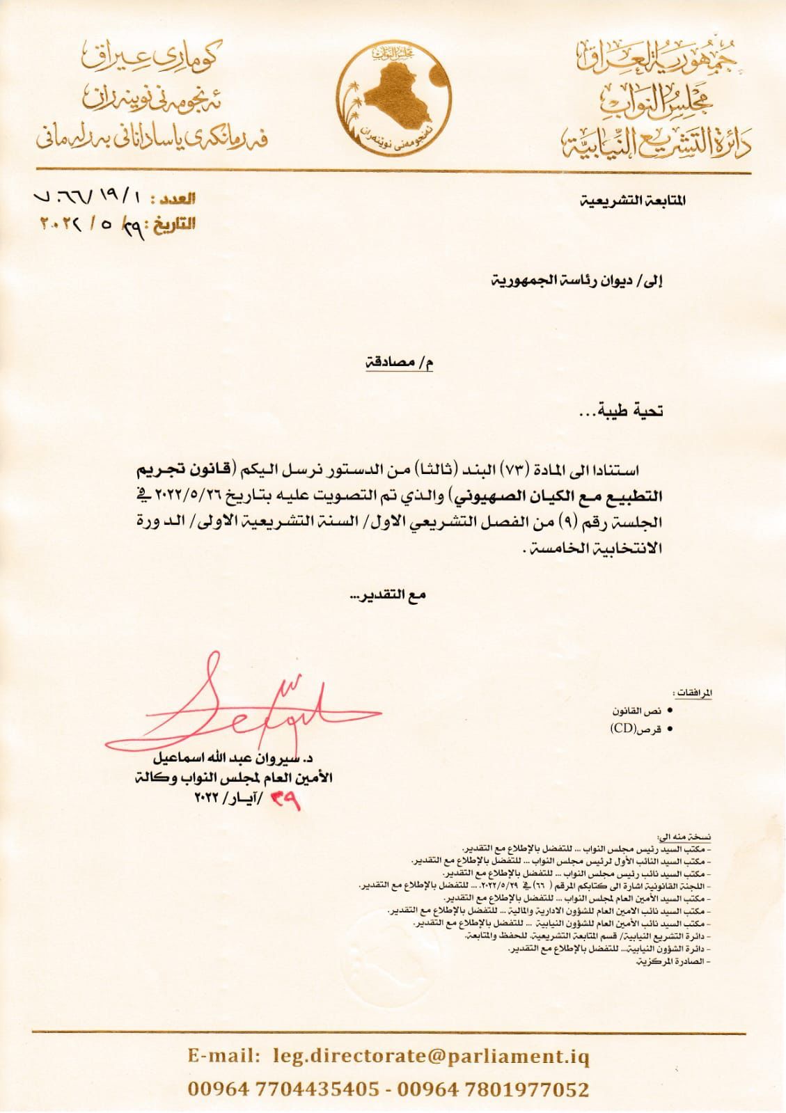 وأظهرت وثيقة صادرة عن البرلمان، واطلعت عليها السومرية نيوز، أنه “استناداً إلى المادة 73 البند (ثالثاً) من الدستور، نرسل إليكم (قانون تجريم التطبيع مع الكيان الصهيوني)، والذي تم التصويت عليه بتاريخ 26 / 5 / 2022”.