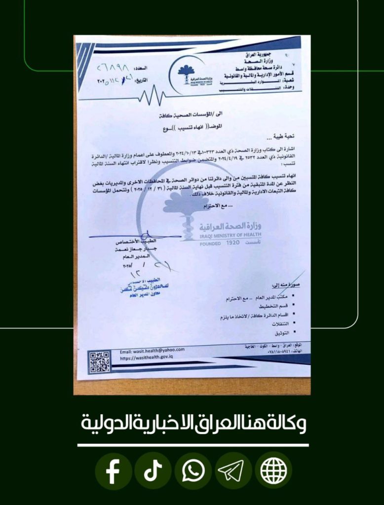 بالوثيقة.. الصحة تنهي عمل الموظفين المنسبين الى دوائرها بسبب انتهاء السنة المالية