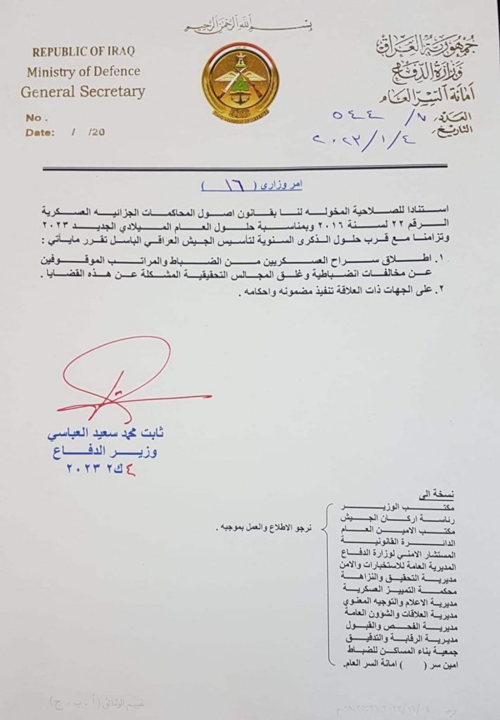 وتضمنت الوثيقة قرار وزير الدفاع باطلاق سراح العسكريين من الضباط والمراتب الموقوفين عن مخالفات انضباطية وغلق المجالس التحقيقية المشكلة عن هذه القضايا.