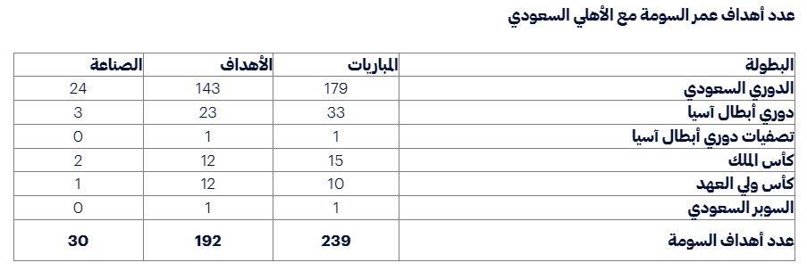 وانضم السومة إلى الأهلي مطلع موسم 2014-15، ومنذ ذلك الحين سجل 192 هدفًا، وصنع 30 في 239 مباراة خاضها مع الفريق في جميع البطولات.