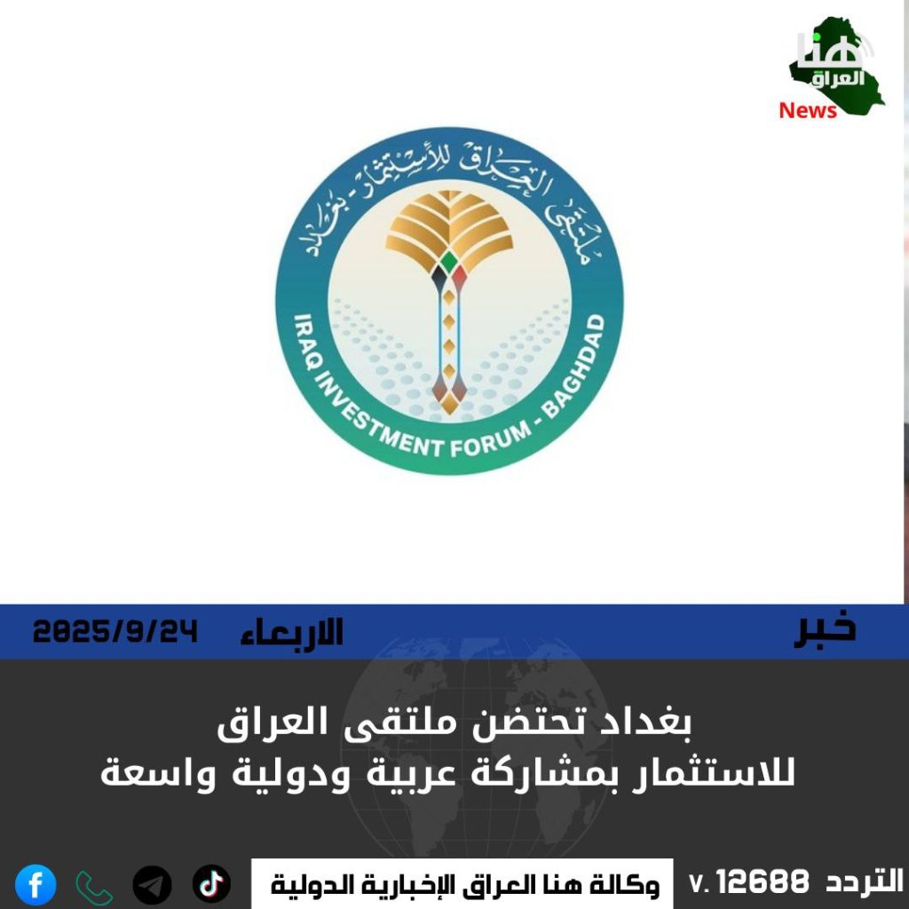 برعاية رئيس مجلس الوزراء السيد محمد شياع السوداني، وتحت شعار (استثمر في بلاد ما بين النهرين)، ينعقد في العاصمة بغداد ملتقى العراق للاستثمار يومي 27 و28 أيلول الجاري، بمشاركة واسعة من دول عربية وأجنبية.