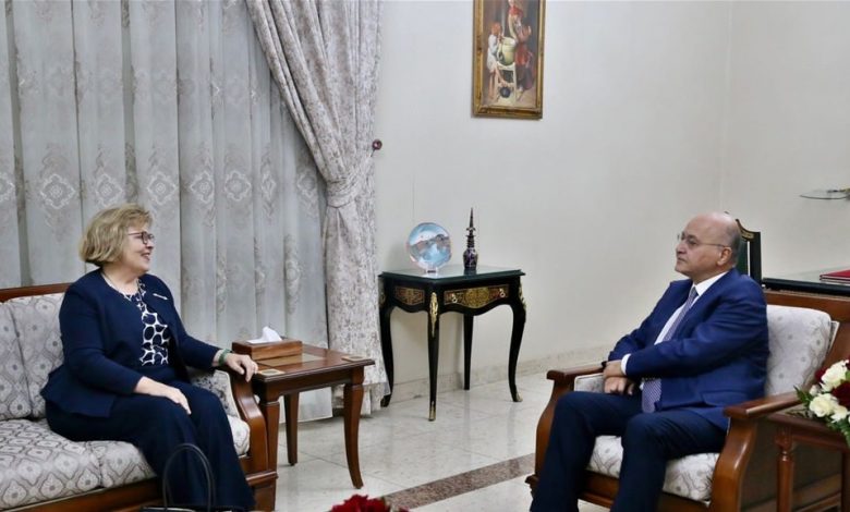 وتابع البيان انه “بشأن الأوضاع الداخلية في البلد، أشار الرئيس برهم صالح إلى “مسار الحوار والتلاقي والمساعي القائمة لمعالجة المسائل السياسية، فيما أكدت السيدة باربرا ليف التزام الولايات المتحدة بدعم أمن واستقرار العراق وسلامة شعبه، ودعم الحوار لمعالجة الأزمة السياسية وبما يُرسخ الاستقرار ويحقق التقدم للعراقيين”.