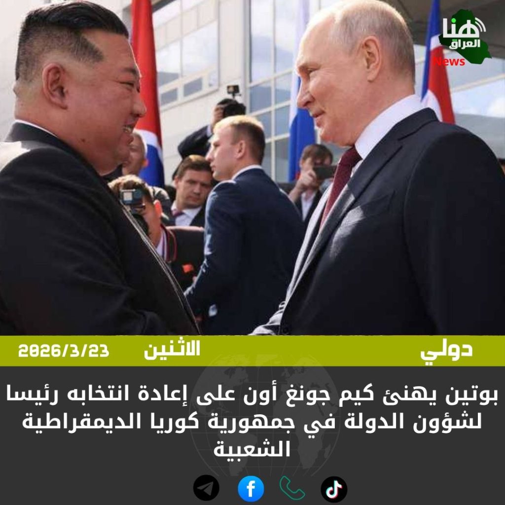 الرئيسية/دولي/بوتين يهنئ كيم جونغ أون على إعادة انتخابه رئيسا لشؤون الدولة في جمهورية كوريا الديمقراطية الشعبية. دوليمحلي بوتين يهنئ كيم جونغ أون على إعادة انتخابه رئيسا لشؤون الدولة في جمهورية كوريا الديمقراطية الشعبية. شاركها فيسبوك X لينكدإن Tumblr بينتيريست Reddit VKontakte Odnoklassniki Pocket مشاركة عبر البريد طباعة