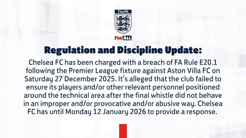 بيان من الإتحاد الإنكليزي لـ نادي تشيلسي: وُجهت إلى نادي تشيلسي لكرة القدم تهمة انتهاك المادة E20.1 من لوائح الاتحاد الإنجليزي لكرة القدم، وذلك عقب مباراة الدوري الإنجليزي الممتاز ضد أستون فيلا يوم السبت 27 ديسمبر 2025. يُزعم أن النادي لم يضمن عدم تصرف لاعبيه و/أو غيرهم من الموظفين المعنيين المتواجدين حول المنطقة الفنية بعد صافرة النهاية بطريقة غير لائقة /أو استفزازية /أو مسيئة