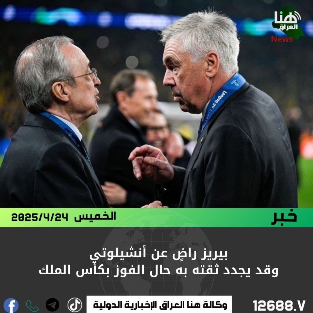 ذكرت صحيفة “آس” الإسبانية أن رئيس نادي ريال مدريد فلورنتينو بيريز راضٍ عن أداء المدرب كارلو أنشيلوتي، وفي حال فوزه بكأس ملك إسبانيا، فإن حظوظه بالبقاء في الموسم المقبل تزداد.