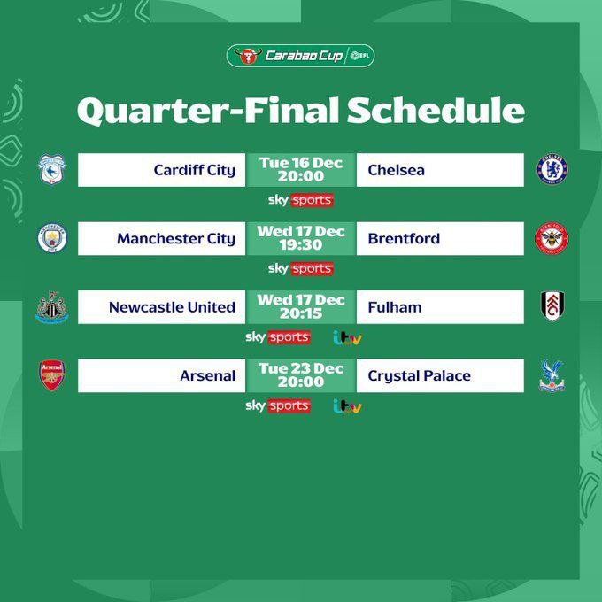 تحديد مواعيد وتوقيتات مباريات ربع نهائي كأس الرابطة الإنجليزية .