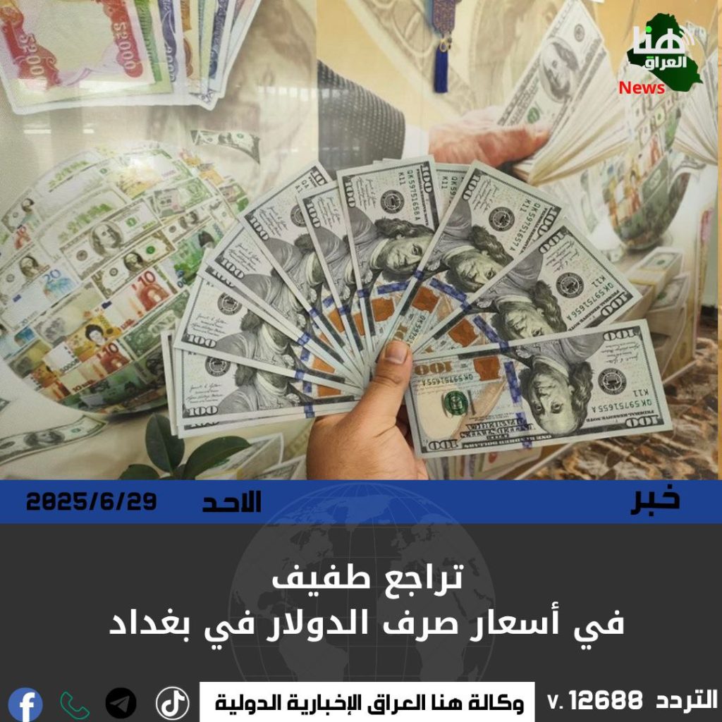 شهدت أسعار صرف الدولار تراجعاً طفيفاً في بورصتي الكفاح والحارثية لتسجل 141,250 ديناراً لكل 100 دولار، فيما استقرت أسعار البيع في الأسواق المحلية عند 142,250 ديناراً وسعر الشراء عند 140,250 ديناراً.