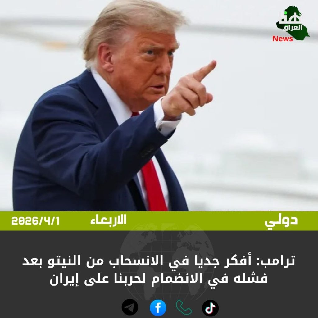 الرئيسية/دولي/ترامب: أفكر جديا في الانسحاب من النيتو بعد فشله في الانضمام لحربنا على إيران دولي ترامب: أفكر جديا في الانسحاب من النيتو بعد فشله في الانضمام لحربنا على إيران شاركها فيسبوك X لينكدإن Tumblr بينتيريست Reddit VKontakte Odnoklassniki Pocket مشاركة عبر البريد طباعة