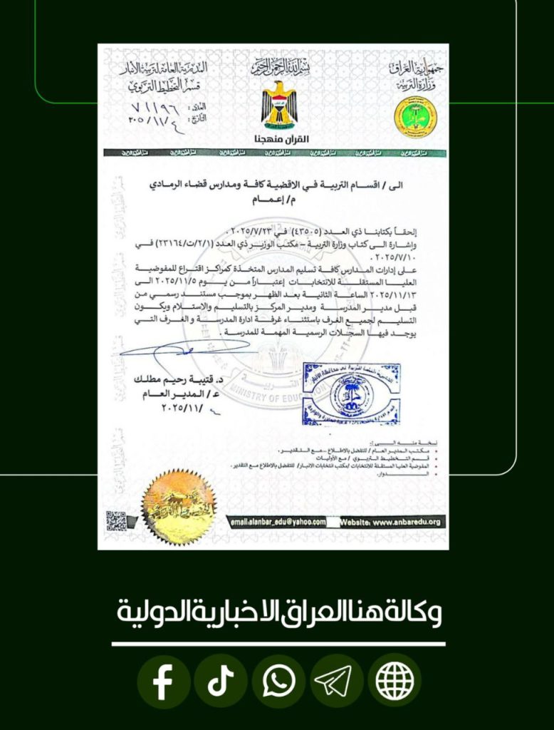 الرئيسية/محلي/تربية الأنبار توجّه بتسليم المدارس المستخدمة كمراكز اقتراع إلى المفوضية العليا للانتخابات اعتبارًا من ٥ تشرين الثاني ٢٠٢٥ محلي تربية الأنبار توجّه بتسليم المدارس المستخدمة كمراكز اقتراع إلى المفوضية العليا للانتخابات اعتبارًا من ٥ تشرين الثاني ٢٠٢٥ شاركها فيسبوك X لينكدإن Tumblr بينتيريست Reddit VKontakte Odnoklassniki Pocket مشاركة عبر البريد طباعة