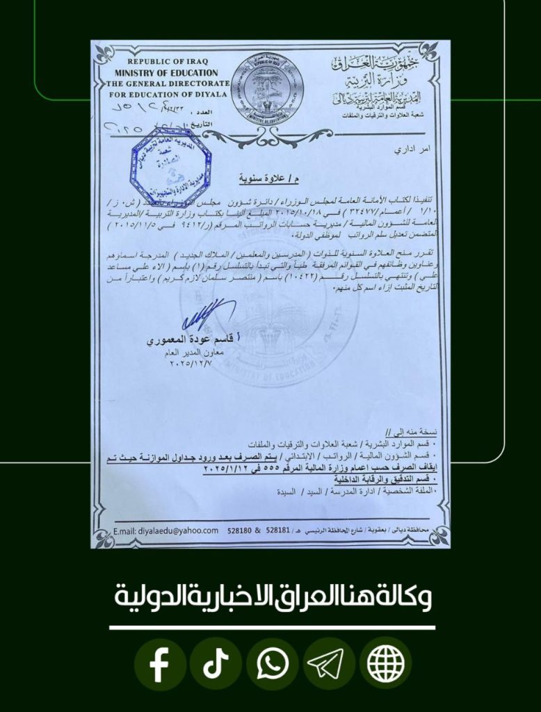 تربية ديالى تمنح العلاوات لأكثر من 10 آلاف من الملاك الجديد