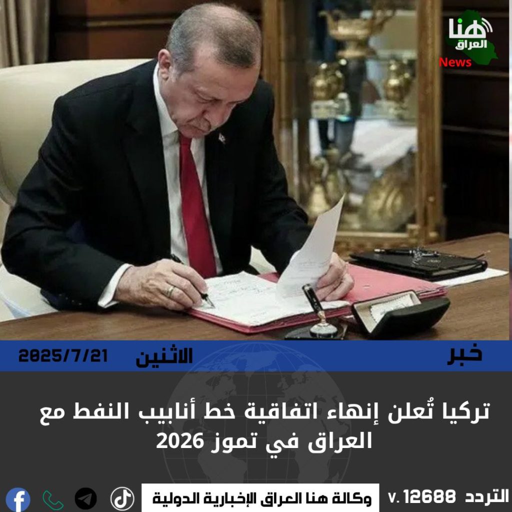 أعلنت وسائل إعلام تركية أن الرئيس رجب طيب أردوغان وقّع قراراً رسمياً بإنهاء اتفاق خط أنابيب النفط مع العراق المبرم منذ عام 1973، على أن يدخل القرار حيّز التنفيذ في 27 تموز 2026، ما يضع حداً لاتفاق استمر لأكثر من نصف قرن بين البلدين.