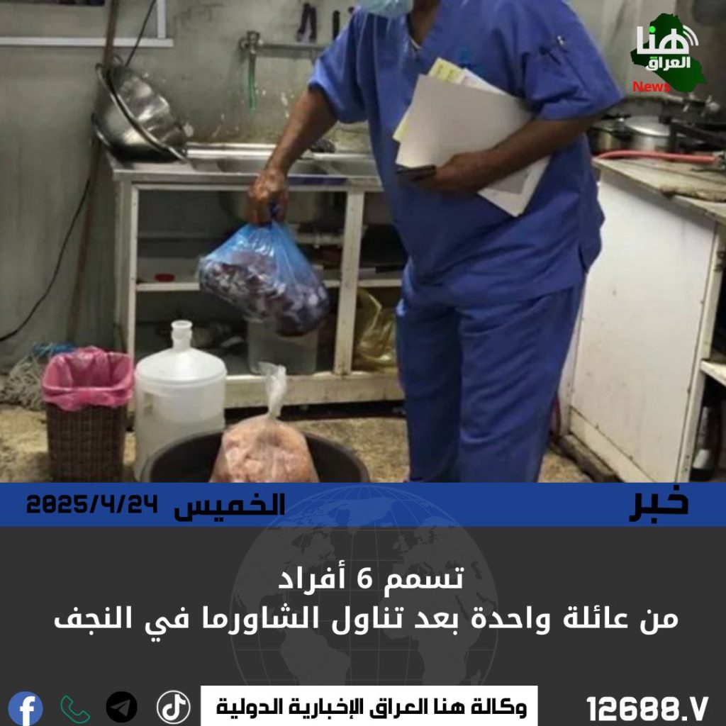 أُصيب ستة أفراد من عائلة واحدة بحالة تسمم غذائي بعد تناولهم وجبة شاورما من أحد مطاعم محافظة النجف. وعلى إثر ذلك، قررت الجهات الرقابية إغلاق المطعم وإيقاف صاحبه عن العمل، فيما نُقل المصابون إلى المستشفى لتلقي العلاج.