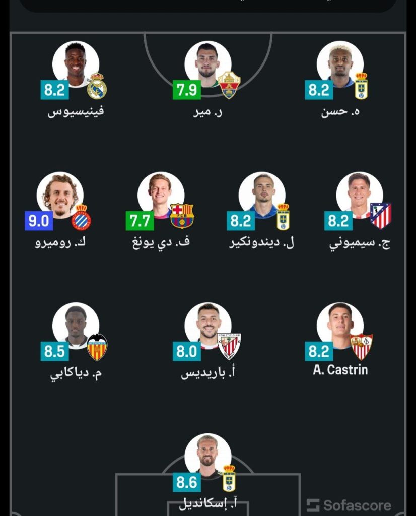 الرئيسية/رياضة/تشكيلة الأسبوع في الدوري الإسباني حسب موقع Sofascore رياضة تشكيلة الأسبوع في الدوري الإسباني حسب موقع Sofascore شاركها فيسبوك X لينكدإن Tumblr بينتيريست Reddit VKontakte Odnoklassniki Pocket مشاركة عبر البريد طباعة